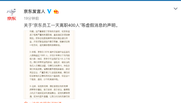 我們發(fā)現(xiàn)近期有媒體和個(gè)人有組織地集中發(fā)布“京東員工一天離職400人”等虛假消息,特聲明如下: