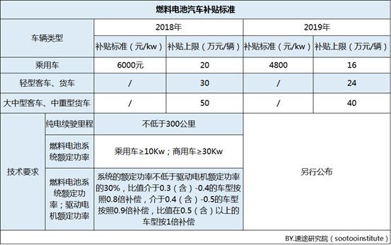2018年燃料電池乘用車按照搭載燃料電池系統的額定功率進行補貼,且規定乘用車額定功率不低于10Kw,補貼標準為6000元/Kw,上限為20萬元/輛。商用車采用定額補貼,輕型客車、貨車每輛30萬,大中型客車、重型貨車每輛50萬,且額定功率不得低于30Kw。