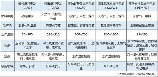 根據電解質的不同,燃料電池又分為堿性燃料電池(AFC)、磷酸燃料電池(PAFC)、熔融碳酸鹽燃料電池(MCFC)、固體氧化物燃料電池(SOFC)和質子交換膜燃料電池(PEMFC)5種。