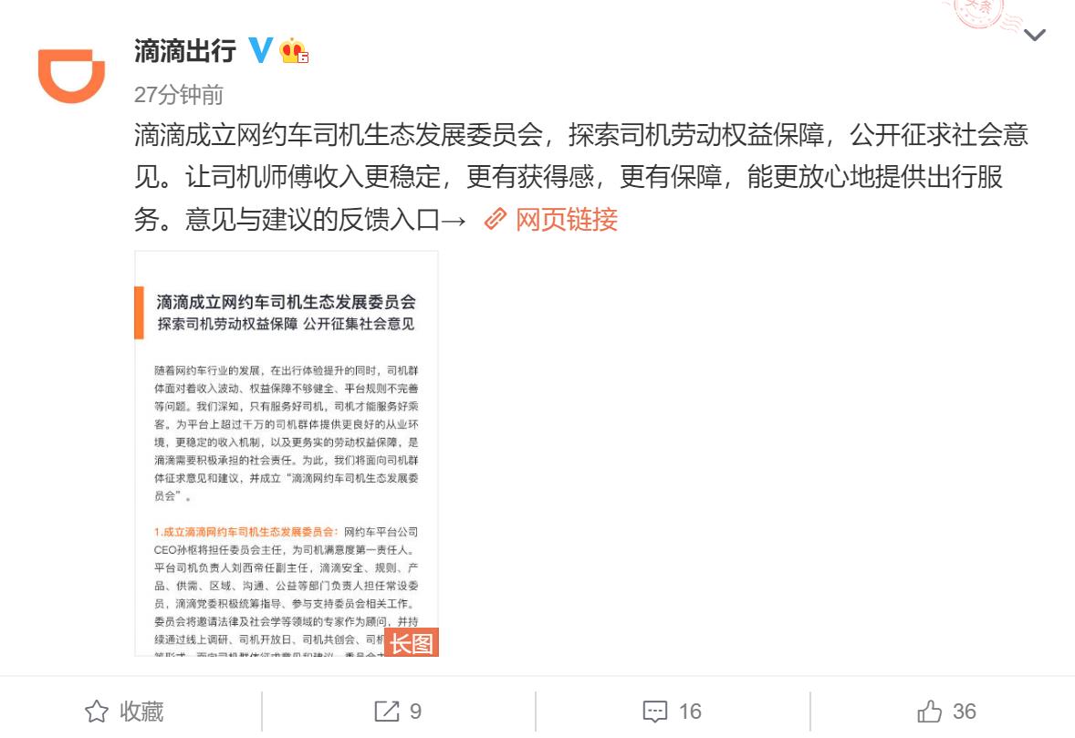 滴滴成立網約車司機生態發展委員會 探索司機勞動權益保障 公開征集社會意見 隨著網約車行業的發展,在出行體驗提升的同時,司機群體面對著收入波動、權益保障不夠健全、平臺規則不完善等問題。我們深知,只有服務好司機,司機才能服務好乘客。為平臺上超過千萬的司機群體提供更良好的從業環境,更穩定的收入機制,以及更務實的勞動權益保障,是滴滴需要積極承擔的社會責任。為此,我們將面向司機群體征求意見和建議,并成立“滴滴網約車司機生態發展委員會”。