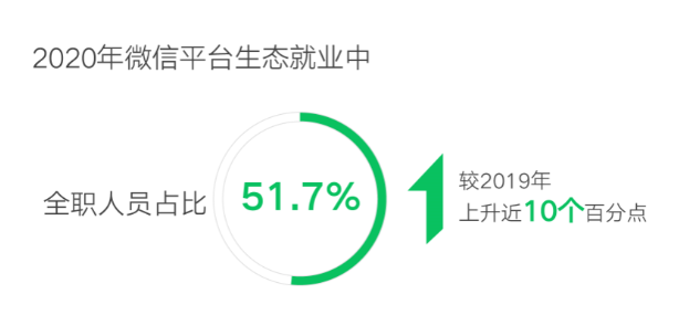 隨著數字生態逐漸成熟,加上疫情影響,全職微經濟的就業者比重上升。受制于出行管控,很多人不得不將互聯網副業“轉正”為新職業賽道,并體會到“靈活用工”的好處。調查數據顯示,2020年微信平臺生態就業中,全職人員占比51.7%,較2019年上升近10個百分點。越來越多的人員“副業”變“主業”,全職投入數字生態就業,微經濟逐漸成為穩定就業形勢、保持經濟平穩增長的一個新賽道。