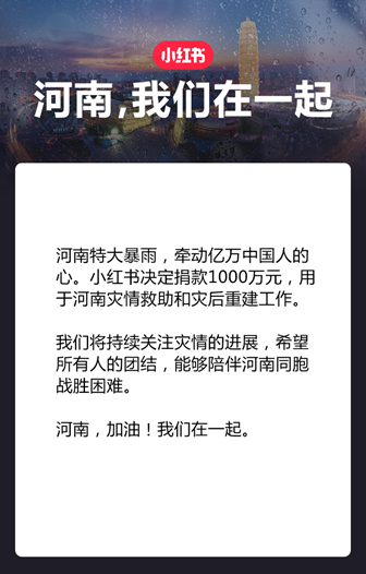 速途網7月21日消息(報道:李楠)河南特大暴雨,牽動億萬中國人的心。小紅書決定捐款1000萬元,用于河南災情救助和災后重建工作。