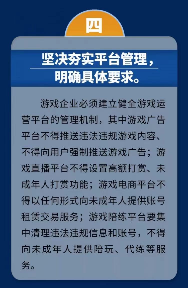 4、堅決夯實平臺管理,明確具體要求。游戲企業(yè)必須建立健全游戲運營平臺的管理機制,其中游戲廣告平臺不得推送違法違規(guī)游戲內(nèi)容、不得向用戶強制推送游戲廣告;游戲直播平臺不得設(shè)置高額打賞、未成年人打賞功能;游戲電商平臺不得以任何形式向未成年人提供賬號租賃交易服務(wù);游戲陪練平臺要集中清理違法違規(guī)信息和賬號,不得向未成年人提供陪玩、代練等服務(wù)。