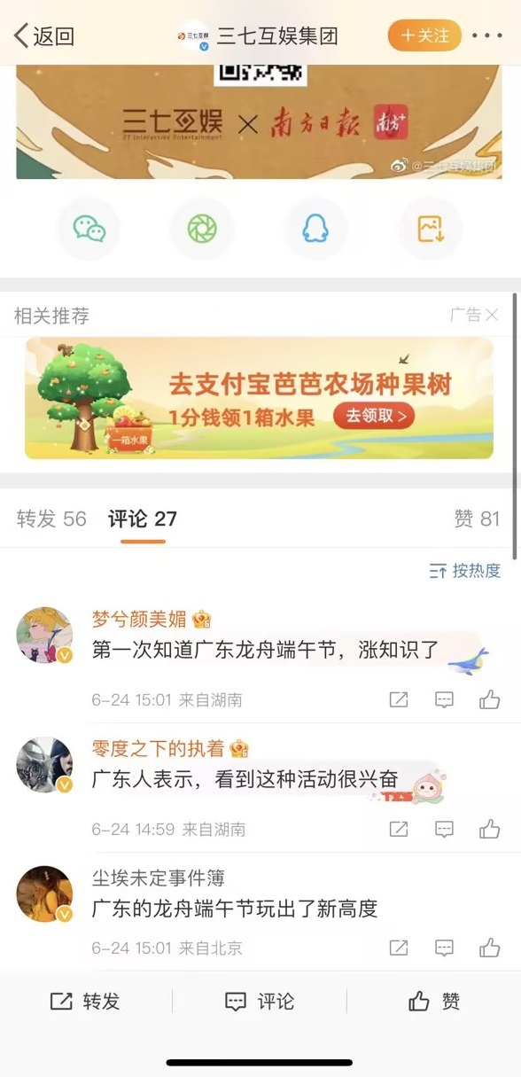 “我覺得挺有意思”“沒想到廣州的龍舟還有這么多故事”……在官方社交平臺,用戶也對游戲給予了多個“好評”。