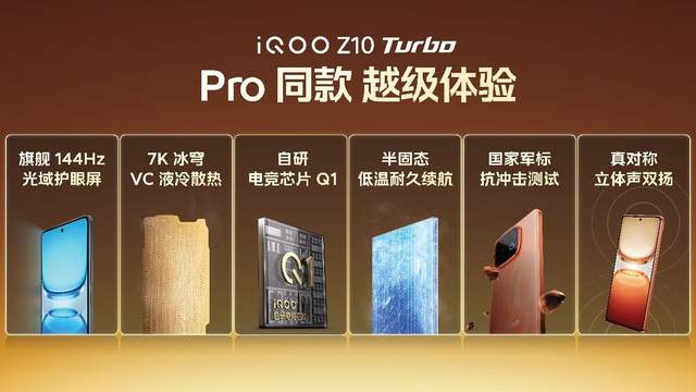 除搭載天璣 8400 滿血版,iQOO Z10 Turbo 核心配置全面看齊Z10 Turbo Pro:機身厚度薄至 8.09mm,通過國家軍標抗沖擊測試,搭載自研電競芯片Q1、旗艦 144Hz 光域護眼屏、24 根環繞式天線、7K 冰穹 VC 液冷散熱系統、5000 萬像素索尼大底光學防抖主攝以及 OriginOS 5等,還通過 KPL 比賽用機測試認證,實力亦達到 Pro 級。