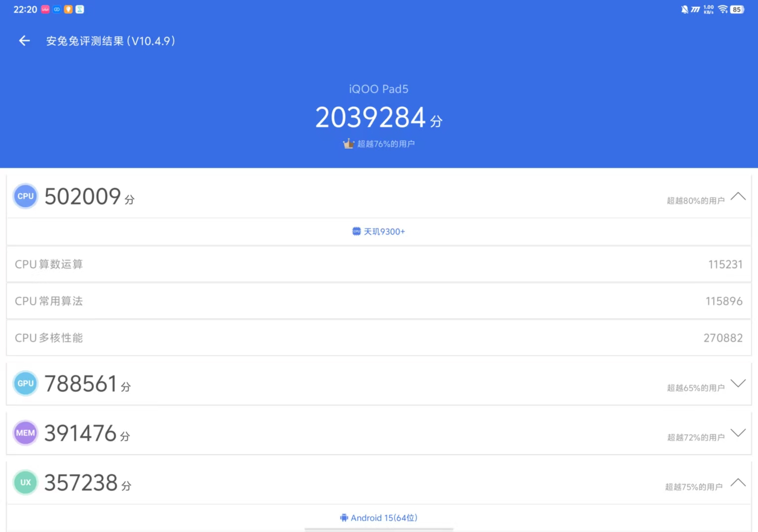 在理論性能測試中,iQOO Pad5在安兔兔V10最新版綜合性能測試中取得了接近204萬的總成績。作為曾經(jīng)的旗艦處理器,這顆9300+足以讓iQOO Pad5應(yīng)對絕大多數(shù)的日常使用場景。