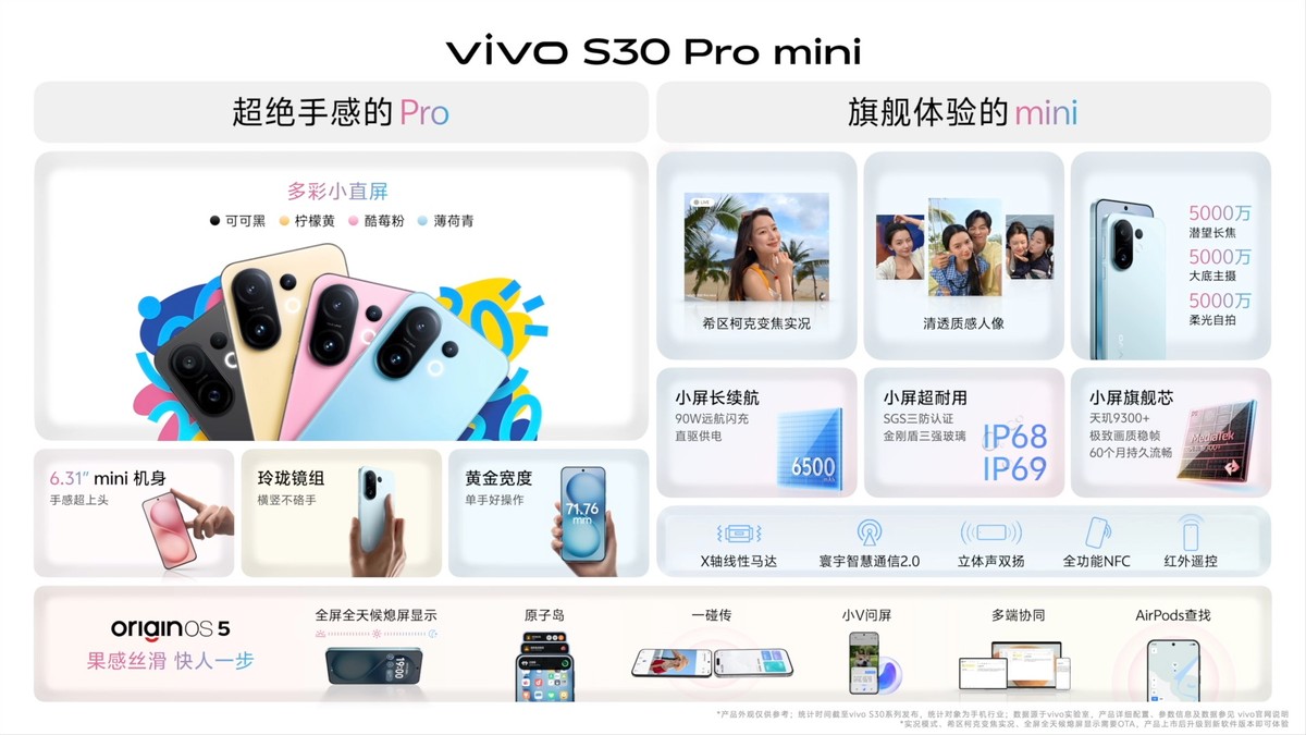 在極致輕薄的機身之下,vivo S30系列以“Pro級”實力打破物理限制,不僅全系搭載6500mAh超大容量藍海電池,以超長續航能力顛覆用戶對小屏手機的續航認知;更是在緊湊的空間內做到了全系標配旗艦級潛望長焦鏡頭,將專業級光學性能濃縮于掌心尺寸。