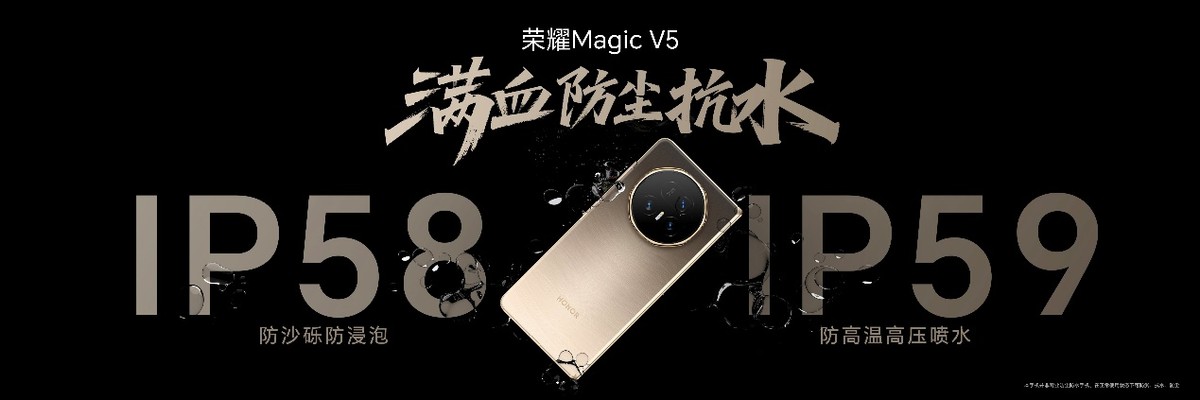 在可靠性方面,榮耀Magic V5搭載新一代金剛巨犀玻璃,防摔、防磨、防刮;滿血防塵抗水,全系支持IP58和IP59。