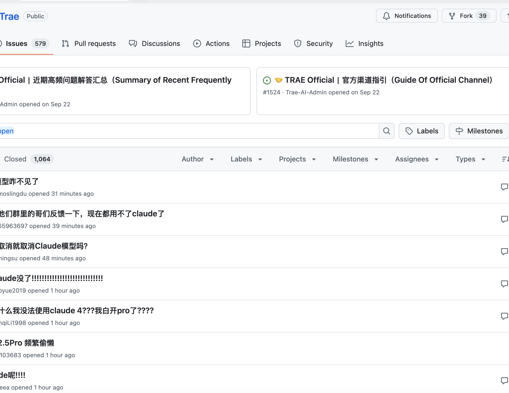 近期,大模型之家注意到,在GitHub社區上,關于Trae“背刺”的聲討此起彼伏:大量購買了Trae年費(Pro版)的用戶發現,他們花真金白銀買下的Pro權限,卻突然發現Trae悄然下架了Claude大模型的使用權限,而這一舉動,引發了開發者沖進了GitHub上的Issue區,紛紛表達自己的不滿。