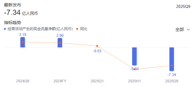 風險警報已經拉響:昆侖萬維2025年前三季度經營性現金流凈額為-7.34億元,較上年同期的3.19億元同比下降330%;有息負債規模達12.72億元,而貨幣資金僅11.1億元,已經低于公司的安全線。